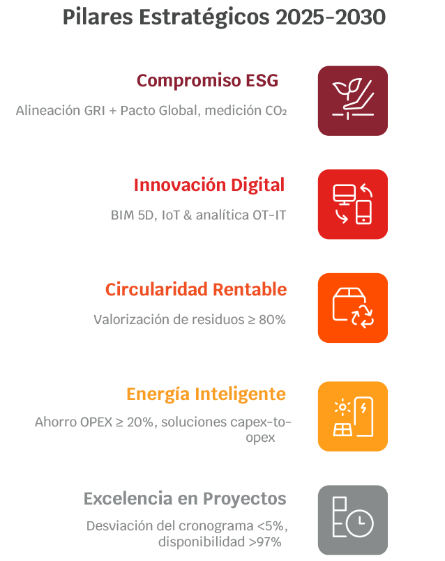 Visión 2025: Ser el socio líder en la región andina que redefine el estándar de desempeño ESG—entregando proyectos sin desviaciones, operaciones energéticamente óptimas y un 95 % de valorización de los pasivos industriales de nuestros clientes.